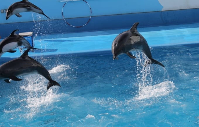 Since the spectator area is covered, you can watch the show even on rainy or snowy days. In addition, an indoor pool is located next to the show pool, so you can see the dolphins swimming freely indoors. In winter or during inclement weather, the show may be held in the indoor pool. Enjoy this impressive performance that lasts about 15 minutes.