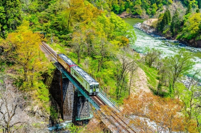 The true charm of the JR Iiyama Line lies in its scenic views. The railway runs alongside the Chikuma River, the longest river in Japan, offering picturesque rural landscapes.