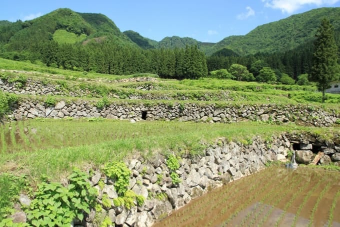 The terraced fields in Fukushima have a gentle slope, with each tier carefully maintained with stone walls, preserving the traditional rural landscape of Japan.