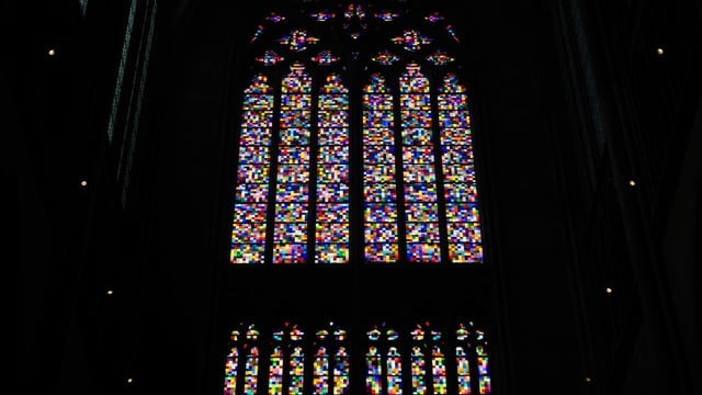 This stained glass design features 11,500 square glass pieces in 72 different colors, arranged in a seemingly random checkerboard pattern generated by a computer.