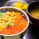 Mako to Yasube is another eatery in Donburi Yokocho. Its most popular dish is the “Morning Market Five-Color Bowl,” a luxurious seafood bowl topped with sea urchin, salmon roe, salmon, scallops, and sweet shrimp!