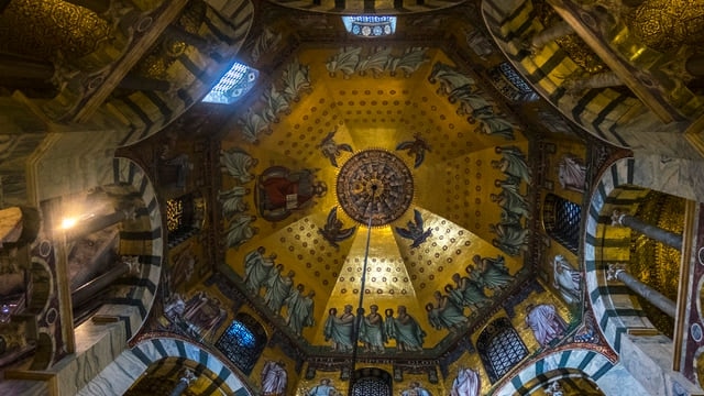 A distinctive feature of this World Heritage Site is the fusion of various architectural styles, including Classical, Byzantine, and Romanesque. At the center is a striking octagonal dome, 32 meters high, which symbolizes resurrection—8 being a sacred and symbolic number in medieval Christian belief.