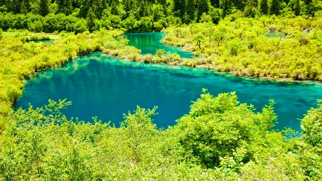 Known for being the clearest lake in Jiuzhaigou, Five Flower Lake sits at the uppermost stream of the Peacock River and is one of the central tourist attractions of the area. Its crystal-blue lakebed clearly reveals travertine deposits, moss, aquatic plants, and sunken trees.