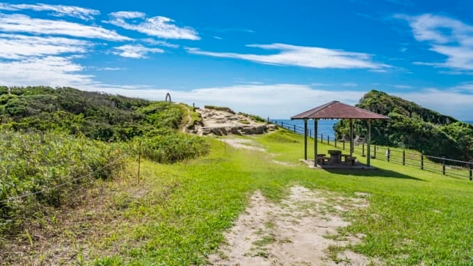Yawata Misaki Park is equipped with walking paths and is perfect for a stroll. You can see Katsuura Bay and the submerged torii gate of the former Tomisaki Shrine—a mystical sight.