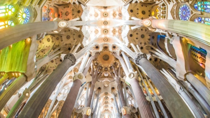 At first glance, the Sagrada Família’s colors may seem subdued, but once inside, that impression changes completely. As with many of Gaudí’s works, the stained glass showcases brilliant use of color and natural light, filling the entire church with a warm, vibrant glow.