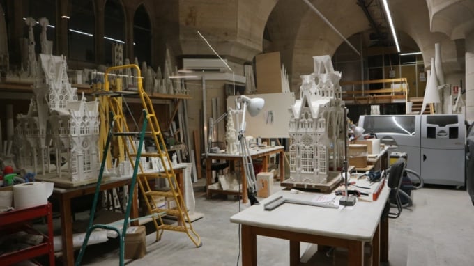 Though it was once said that it would take about 300 years to complete, the Sagrada Família's construction schedule has been significantly shortened. Initially, all models and blueprints were created by hand, but thanks to advances in IT technology, it’s now possible to use 3D design and CG to create visual projections of the final structure.