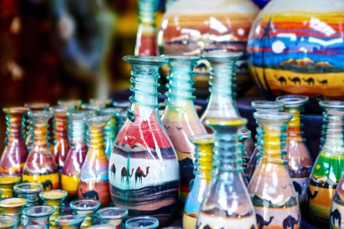 When you visit Petra, you’ll find yourself pausing to watch live sand art performances. Just by layering colorful sands following a design in the artist’s mind, they can create detailed images, even of tiny camels—truly works of art! The colored sand is made by crushing sandstone found around Petra, making it a true Petra-made souvenir.