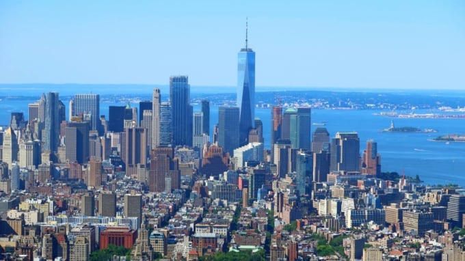 The photo shows the southern view. You can look down on One World Trade Center, SOHO, and Wall Street. The island visible in the distance is Staten Island.
