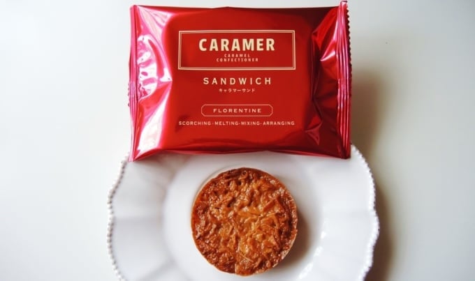 Caramer Sand consists of almond florentines and butter sablé cookies, with fresh cream and melting caramel sandwiched in between.