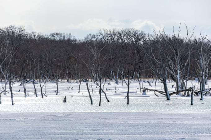 Shaped like a shrimp’s tail, Notsuke Peninsula is home to numerous attractions, including the “Todowara,” a breathtaking area where withered Sakhalin fir trees—eroded by seawater—create a unique, otherworldly landscape.