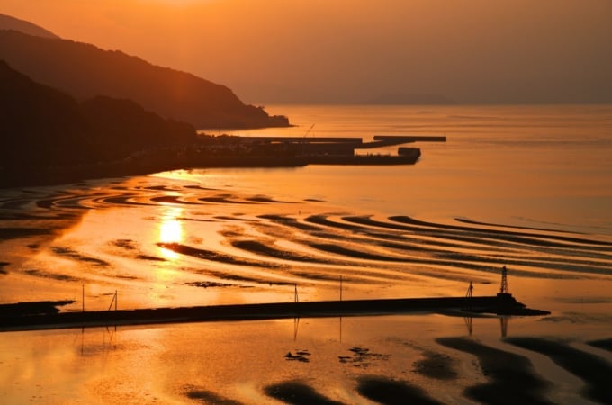 The large tidal range of the Ariake Sea creates these natural “sand art” patterns. As the tide begins to recede, waves and wind trace beautiful curves across the tidal flats. At sunset, the crescent-shaped curves glow orange; during twilight, they take on a soft purple; in bright daylight, they shine silver; and under a full moon, they glisten gold.