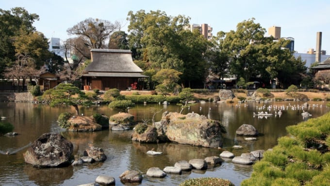 Suizenji Jojuen, located in Kumamoto City, was originally established when Tadatoshi, the first lord of the Higo Hosokawa domain, visited the area on a falconry trip and fell in love with the location, leading to the construction of Suizenji Ochaya teahouse.
