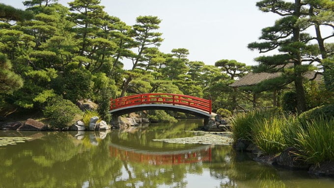 This is a daimyo strolling garden designed after the Eight Views of Omi. The garden features a pond modeled after Lake Biwa and islands representing Omi’s scenic spots. It was built in 1688 by Kyogoku Takatoyo, the second lord of the Marugame domain.
