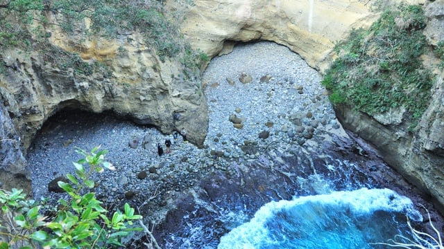 When you descend into the cave, you are greeted by a breathtakingly beautiful sight. Sunlight streaming through the skylight sparkles on the emerald-green sea that surges into the cave, creating an indescribably mystical atmosphere. Although the many small rocks make the footing a bit difficult, it is absolutely worth seeing!