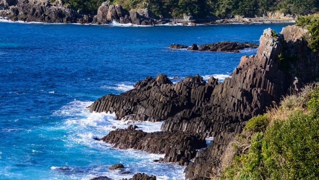 A rocky cliff with countless cracks shaped like rectangular pillars. These columnar joints, formed when magma intruded into the strata and solidified, can be seen at “Tsumekizaki” in Shimoda. Tsumekizaki, part of the Izu Peninsula Geosite, also has another face as the “wild daffodil habitat.”