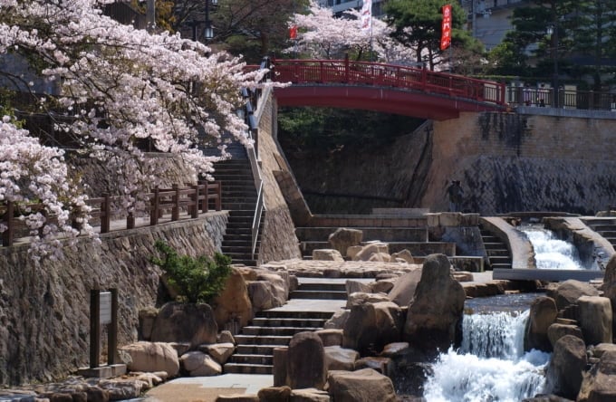 At the end of the Kobe Electric Railway’s Arima Line lies Arima Station, the gateway to the famous Arima Onsen hot spring town in Hyogo, Japan. Stepping out of the station and walking a short distance to the right, you’ll find Yumemuri Plaza, featuring a waterfall designed to resemble rising steam and a statue of Toyotomi Hideyoshi. Across the street to the left, the Taiko Bridge gracefully spans the Arima River.