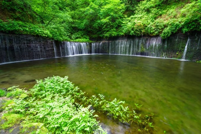 Shiraito Falls is a sightseeing spot located in Karuizawa, Nagano Prefecture, where you can enjoy the mysteries of nature. The waterfall is formed by underground water springing out from a cliff, with a drop of about 3 meters. True to its name, the underground water flows like numerous white threads, creating a curtain-like appearance where you can feel a rich amount of negative ions.
